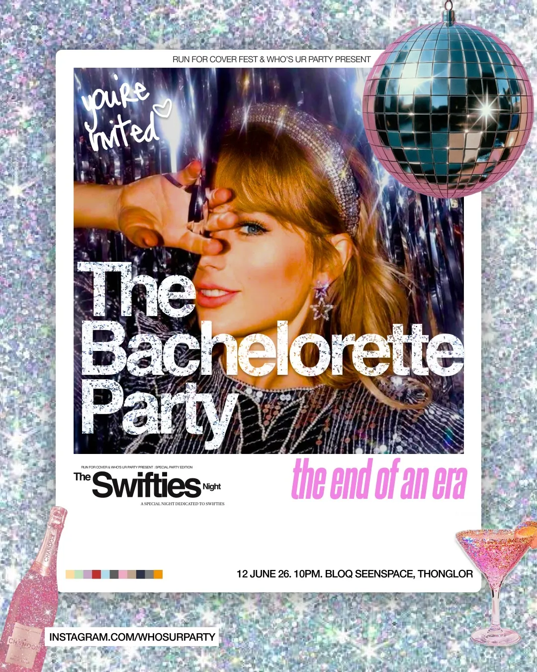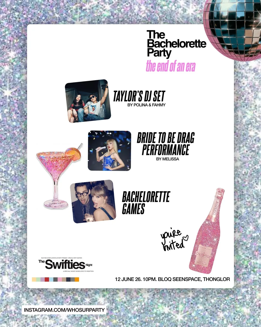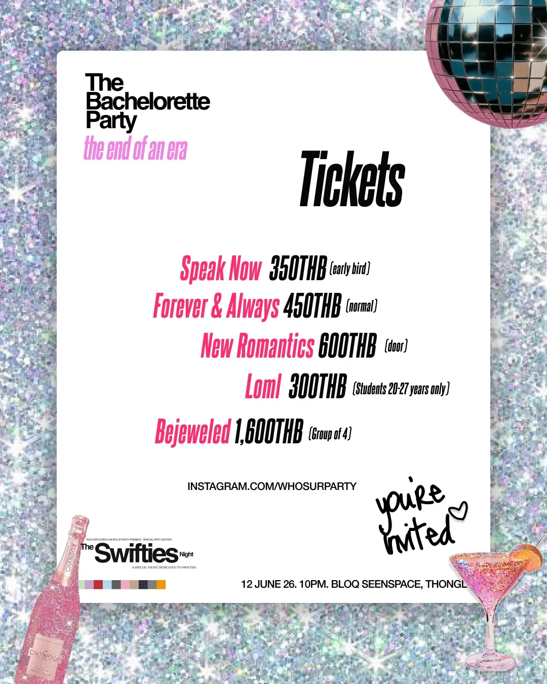 Ticket prices: Early bird 350 THB, Normal 450 THB, Door 600 THB, Students (20-27 years only) 300 THB, Group of 4 (Bejeweled) 1,600 THB. Featuring Taylor's DJ Set by Polina & Fahmy, Bride to Be Drag Performance by Melissa, and Bachelorette Games.